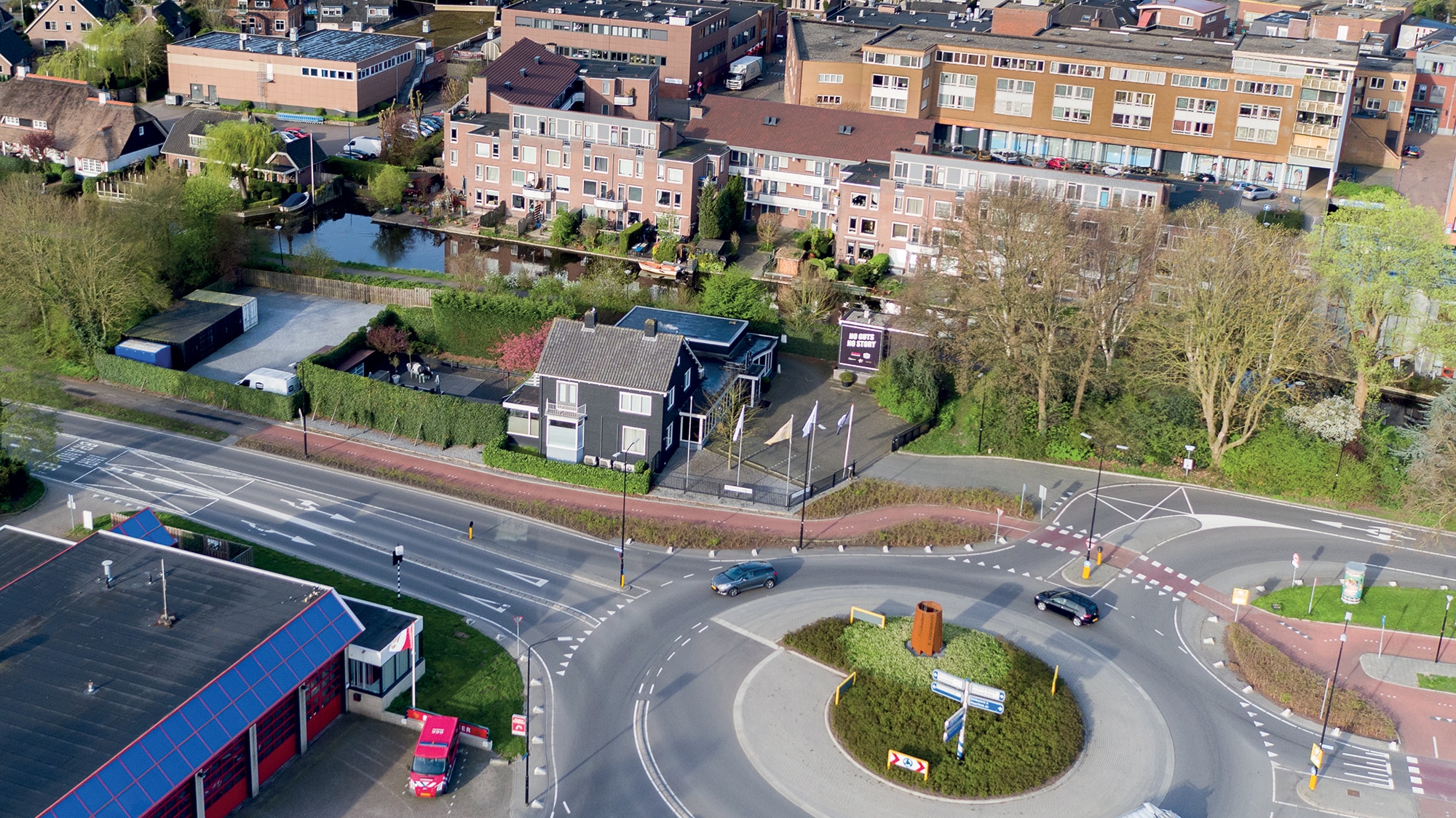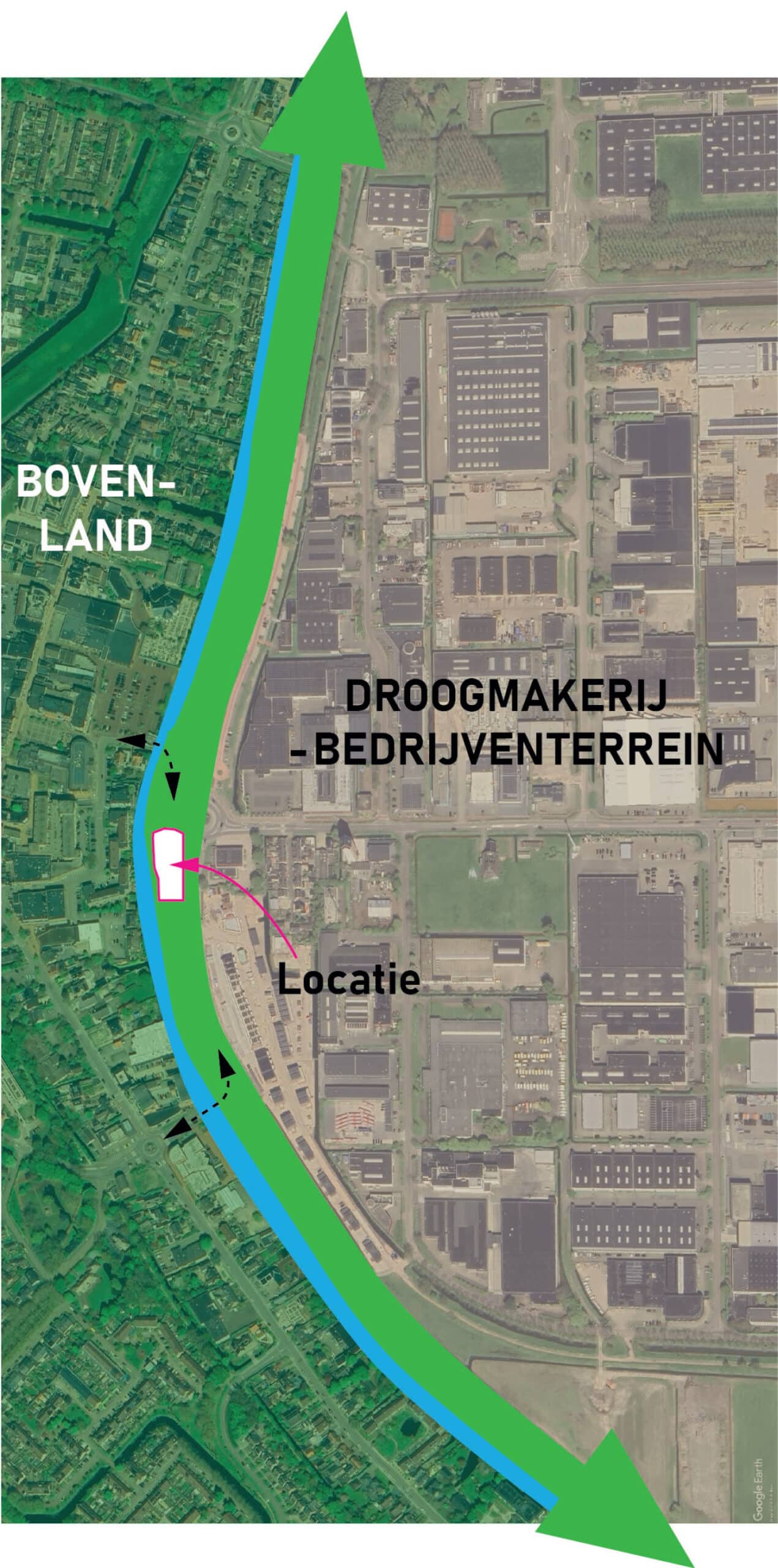 De groen/blauwe structuur langs de rondweg/ringvaart is onderdeel van een