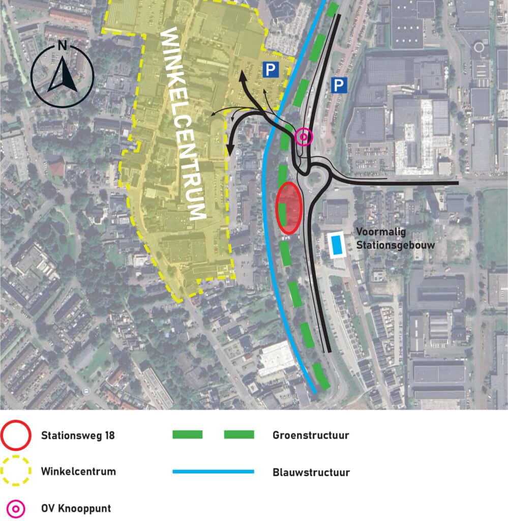 structuur. Het is de verbinding tussen het (winkel)centrum met het parkeerterrein en de Rondweg, Industrieweg, het OV-knooppunt en langparkeerterrein. Het winkelcentrum speelt een cruciale rol voor Mijdrecht en de omliggende dorpen, en trekt dagelijks veel bezoekers. Dit gemengde gebied heeft hiermee een zuigende werking en daarmee is de Stationsweg 18 als herkenningspunt bij dit knooppunt erg belangrijk voor het dorp.