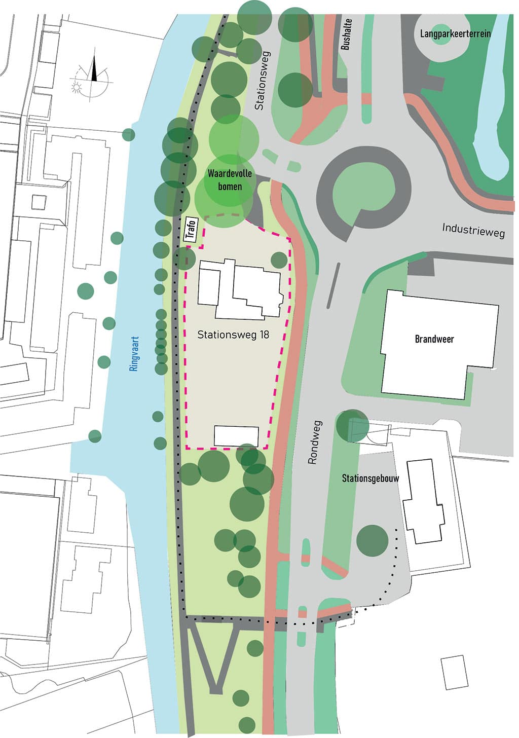 De locatie betreft het perceel aan de Stationsweg 18, met een oppervlakte van circa 1.800 m², centraal gelegen in Mijdrecht. Dit perceel bevindt zich ten westen van het stationsgebouw en ligt bij de entree van het centrum, richting het winkelgebied. Het grenst aan de rondweg, die fungeert als ontsluitingsweg voor Mijdrecht en tevens samen met de ringvaart deel uitmaakt van de groen/blauwe structuur van het dorp. Oostelijk van de locatie ligt het bedrijventerrein van Mijdrecht.